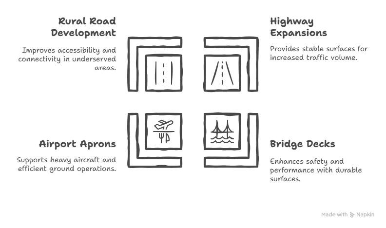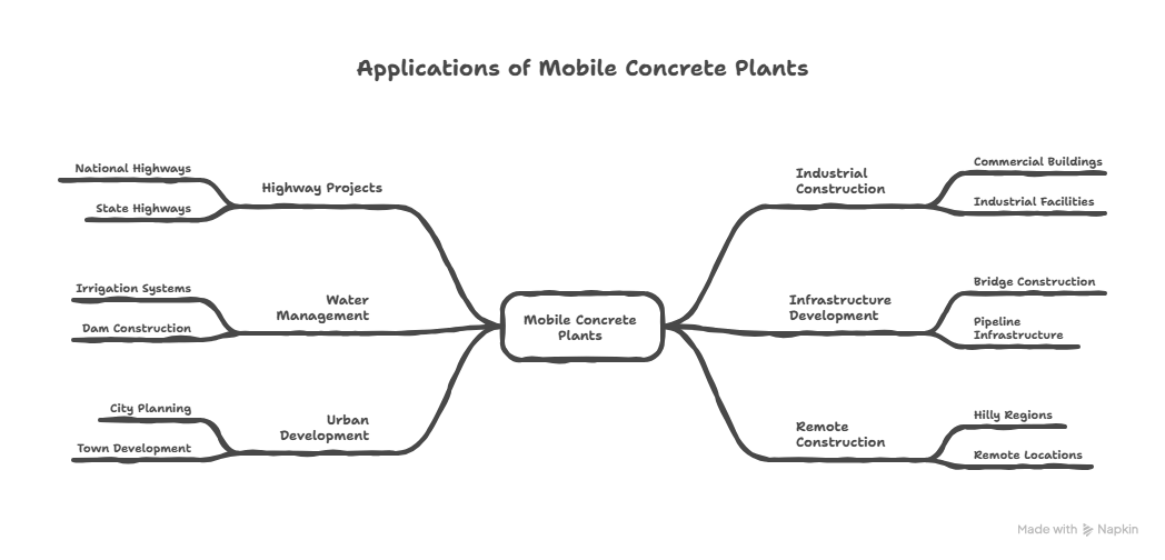 The ability to customise mix designs, maintain uniformity, and respond quickly to field conditions makes mobile plants essential for: